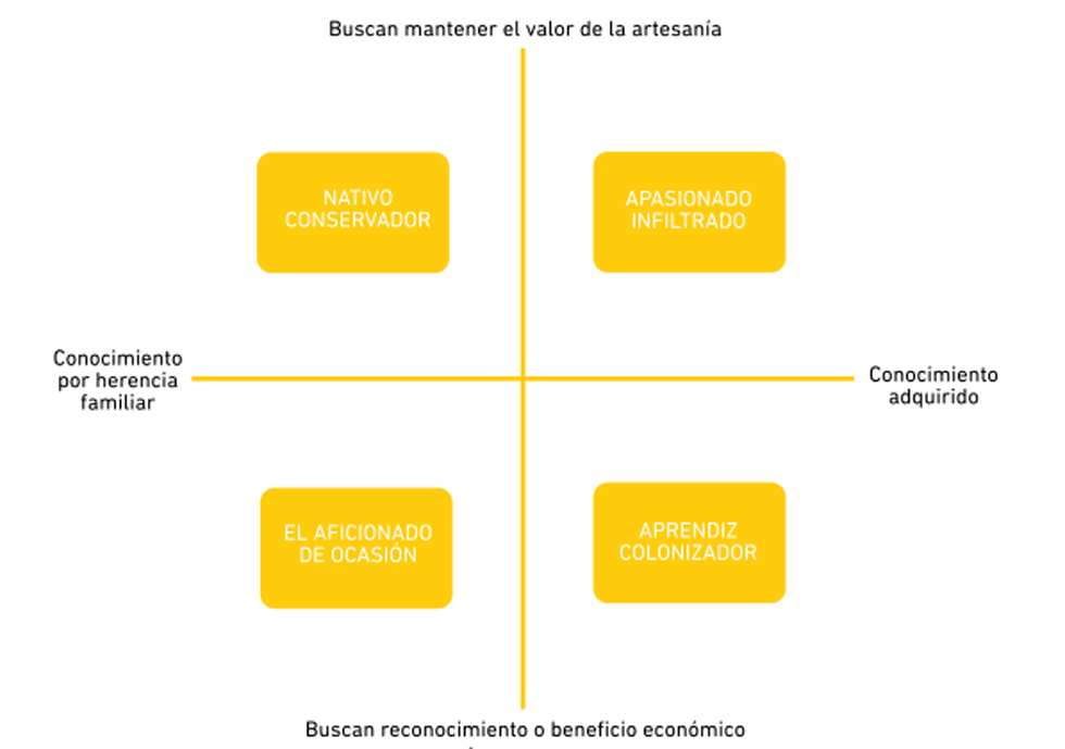 Se identificaron diferentes actores en el proceso que va desde la producción artesanal hasta su comercialización. Los cuales se clasificaron en usuarios, artesanos e intermediarios. Estos se dividieron en 4 arquetipos, para poder realizar una investigación y observar sus comportamientos. Los arquetipos son perfiles de personas que se clasifican de acuerdo a los comportamientos, los cuales se pueden agrupar en características que se desenvuelven en una historia.