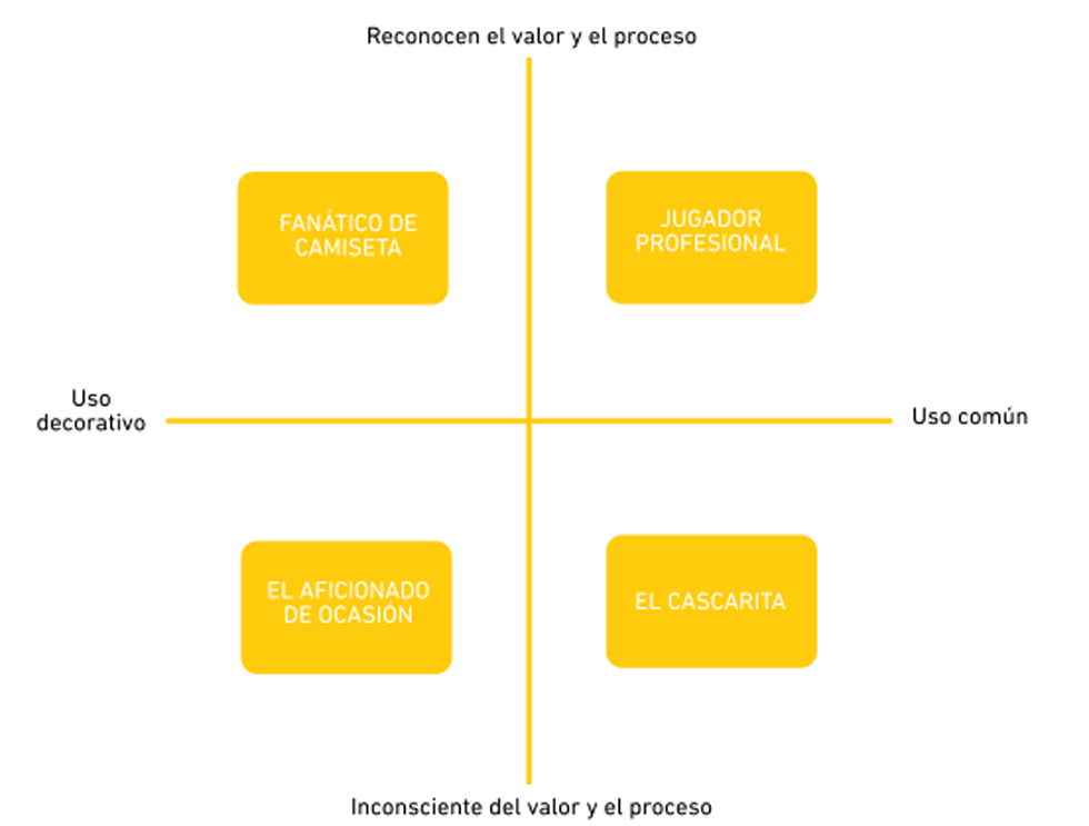 Usuarios: Son los que compran y usan los objetos artesanales, pueden ser compradores frecuentes u ocasionales, pueden adquirir un producto artesanal por diversas razones y pueden o no valorar el producto artesanal. Para nombrarlos se eligió una analogía con el fútbol, representando así la experiencia y compromiso en el juego (compra de artesanías) y el tipo de juego que se lleva a cabo (uso que se le da a los objetos.)
