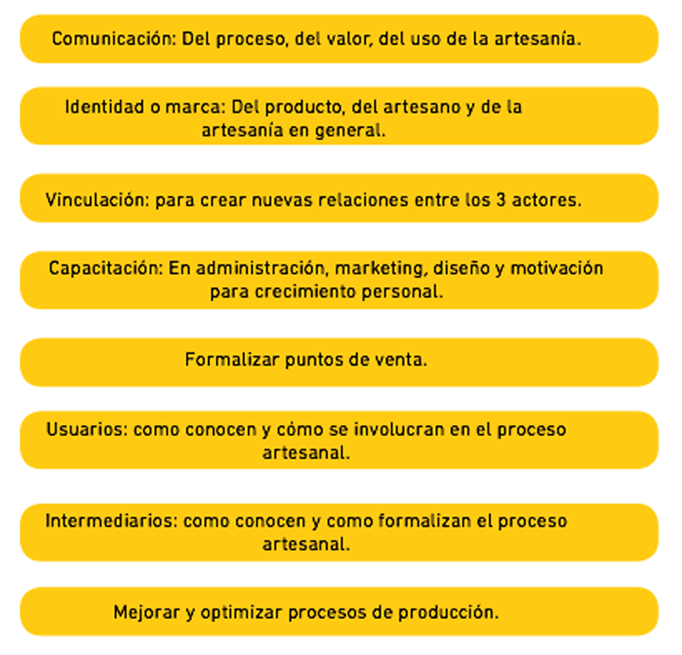 Cada una de las estrategias esta relacionada con la capacitación en temas de administración, diseño y marketing. Se busca la transmisión de conocimiento entre generaciones tanto de técnica como de herramientas administrativas para formalizar su trabajo, como son costos y precios.