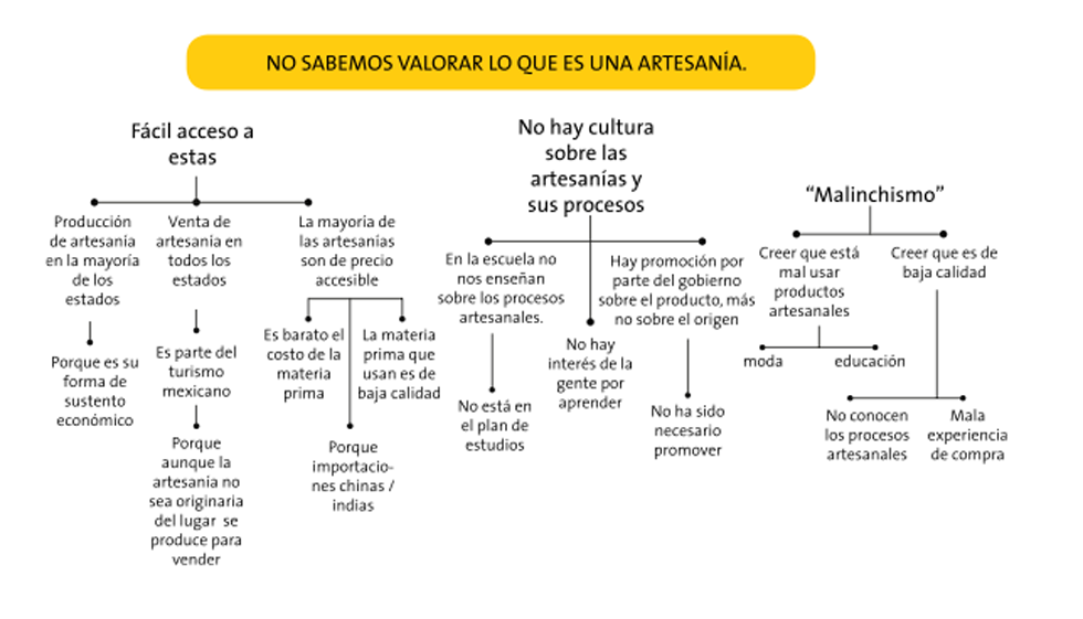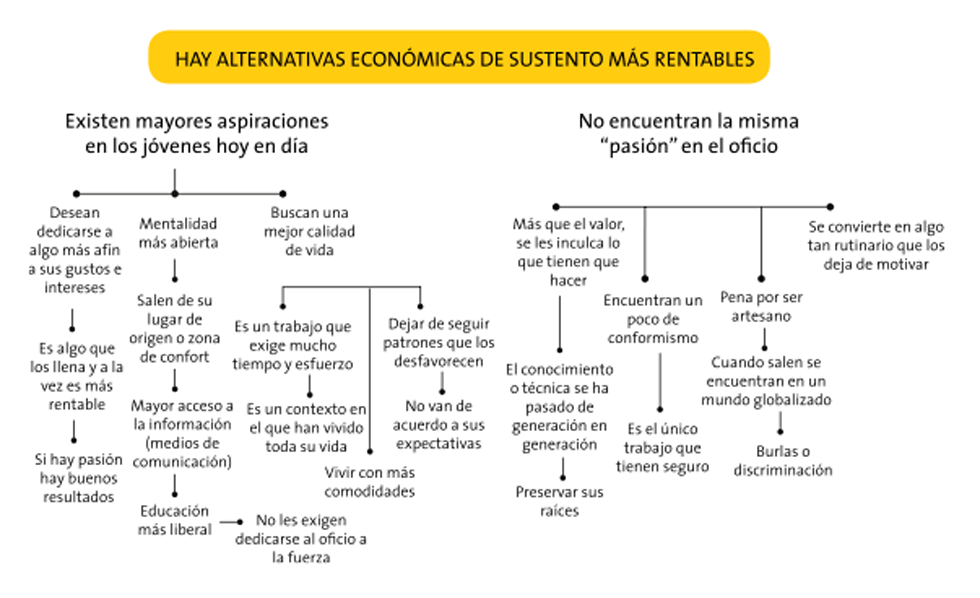 Artesano: Pensar que antes se valoraba más su trabajo. Percepción de la correlación entre hacer y vender. Resignación al futuro de su oficio. El oficio es parte de su identidad. Preocupación por que desaparezca el oficio. Buscar apoyo del gobierno para la solución de los problemas. El trabajo artesanal es un tema familiar. Existe rivalidad entre artesanos y celos entre técnicas. No hay claridad de valor con respecto a la función, estética o técnica.