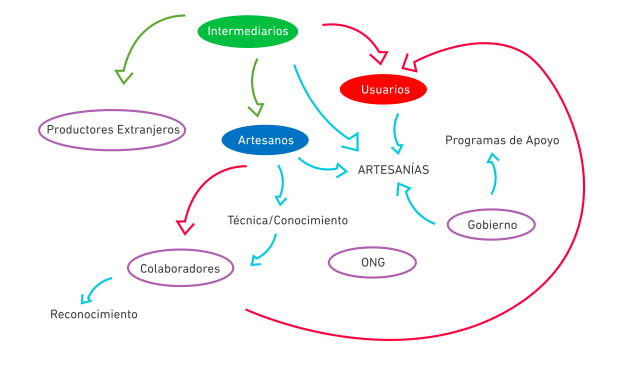 Intermediarios: Son las persona que conectan a los usuarios con los artesanos, normalmente compra el producto de los artesanos y lo revende a los usuarios. Puede agregar alguna característica para generar valor, o simplemente realiza una venta en otra localidad.