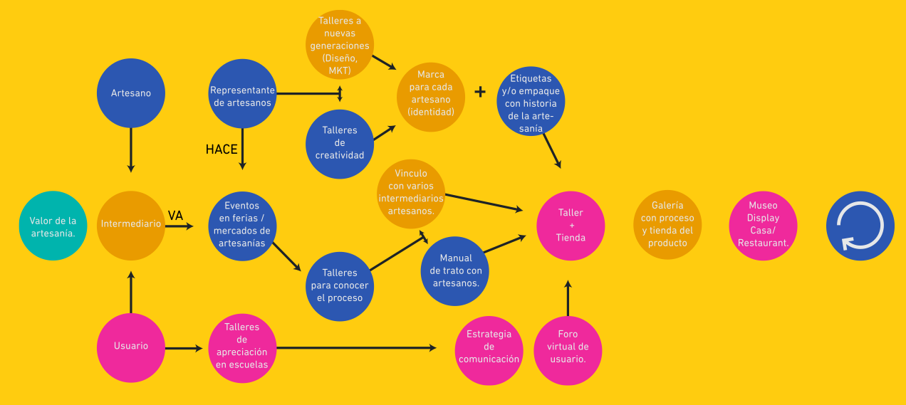 Esta estrategia busca crear un ciclo continuo que vaya mejorando y creciendo. Esto requiere la colaboración entre artesanos y espacios donde se pueda conceptualizar y experimentar para la crea una identidad de producto y marca que respalde y de formalidad al trabajo de cada artesano.