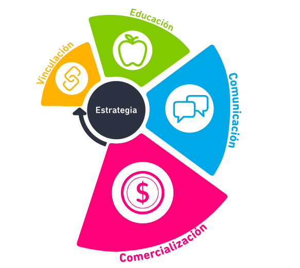 El siguiente diagrama incluye las diferentes soluciones aplicadas a cada actor pero al mismo tiempo conecta a los actores en un corto, mediano y largo plazo. Estas soluciones se clasifican principalmente en vinculación, educación, comunicación y comercialización.