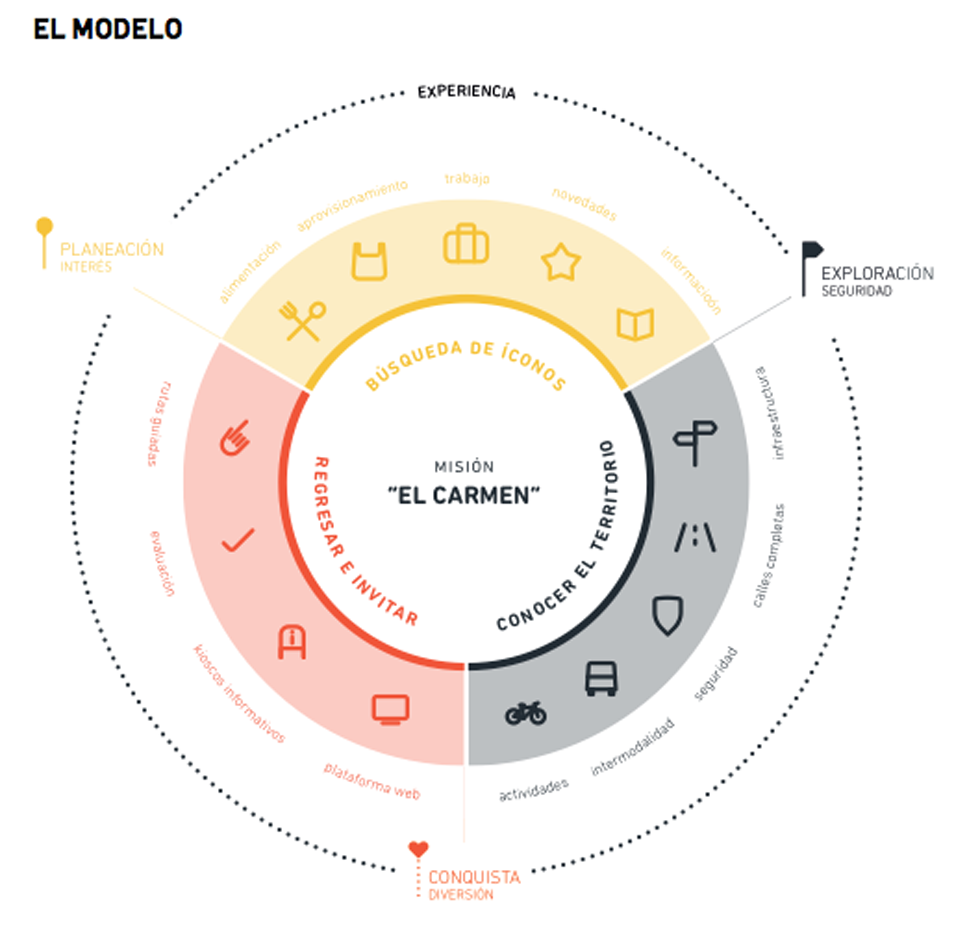 La propuesta que planteamos tiene en mente generar beneficios a través de un modelo de experiencia. Tomando en cuenta las necesidades tanto de paseantes como negocios, buscamos satisfacer las necesidades para ambos grupos en una situación que resulte en ganar-ganar. Lo representamos como un círculo porque la experiencia es un ciclo que busca repetirse. Para este modelo planteamos tres ejes estratégicos.
