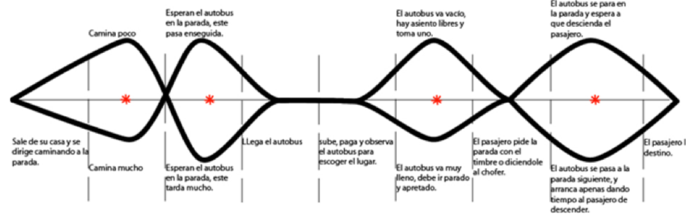 El proceso para realizar el viaje inicia con la persona subiéndose a la unidad, paga su pasaje al chofer y espera su cambio. El pasajero observa hacia el inte- rior del autobús para determinar su lugar durante el trayecto. Si hay asientos disponibles escoge acorde a sus gustos o que tan rápido se debe bajar, los lugares cercanos a las puertas son los más utilizados. Inclu- so cuando las personas deben ir de pie buscan esta cercanía.