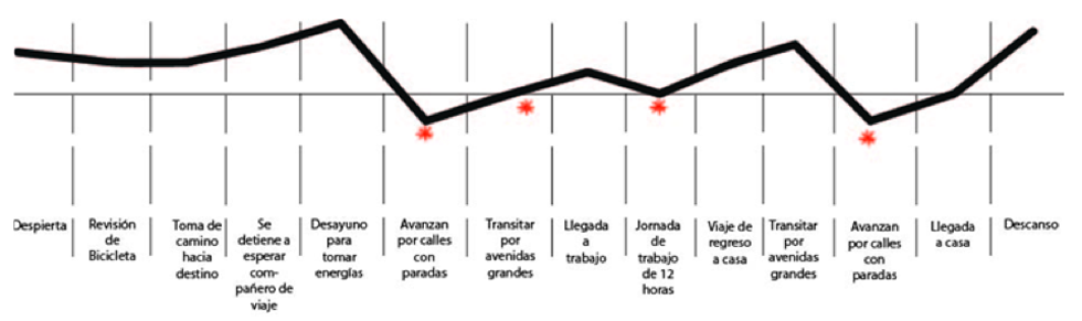 Ciclistas: Dentro de los usuarios que se mueven en bicicleta existe una categoría que lo hace por gusto, más no por una necesidad. Para esta investigación se realizaron diversas actividades de empatía y entrevistas que ayu- daron a entender las necesidades de estos usuarios, así como también las razones por las cuales optan por este medio de transporte. Se notó como la mayoría de los automovilis- tas no tienen respeto por los ciclistas; muchas veces tocaban el claxon o gritaban insultos afirmando que los ciclistas “estorban el paso”.