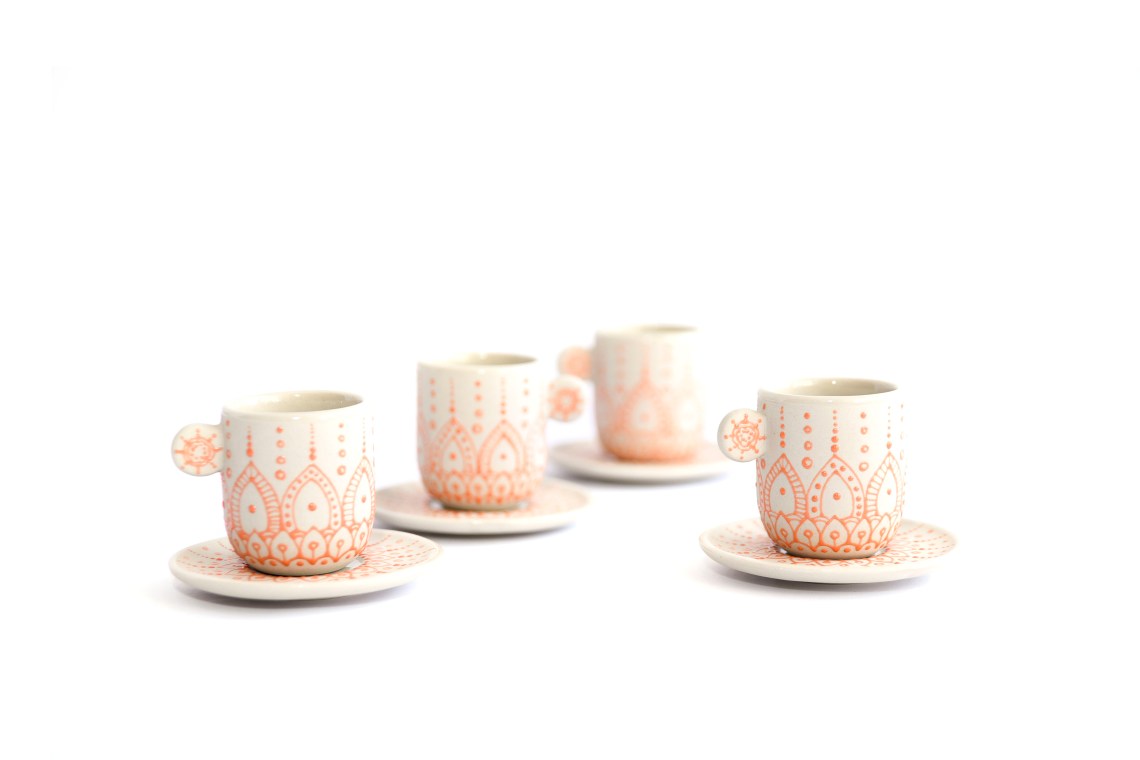 El set de espresso es decorado a mano con la tradicional técnica de la familia Servín, con figuras y colores que reflejan armonía y calma. Se ha utilizado cerámica de alta temperatura horneada a 1240o, sin plomo.