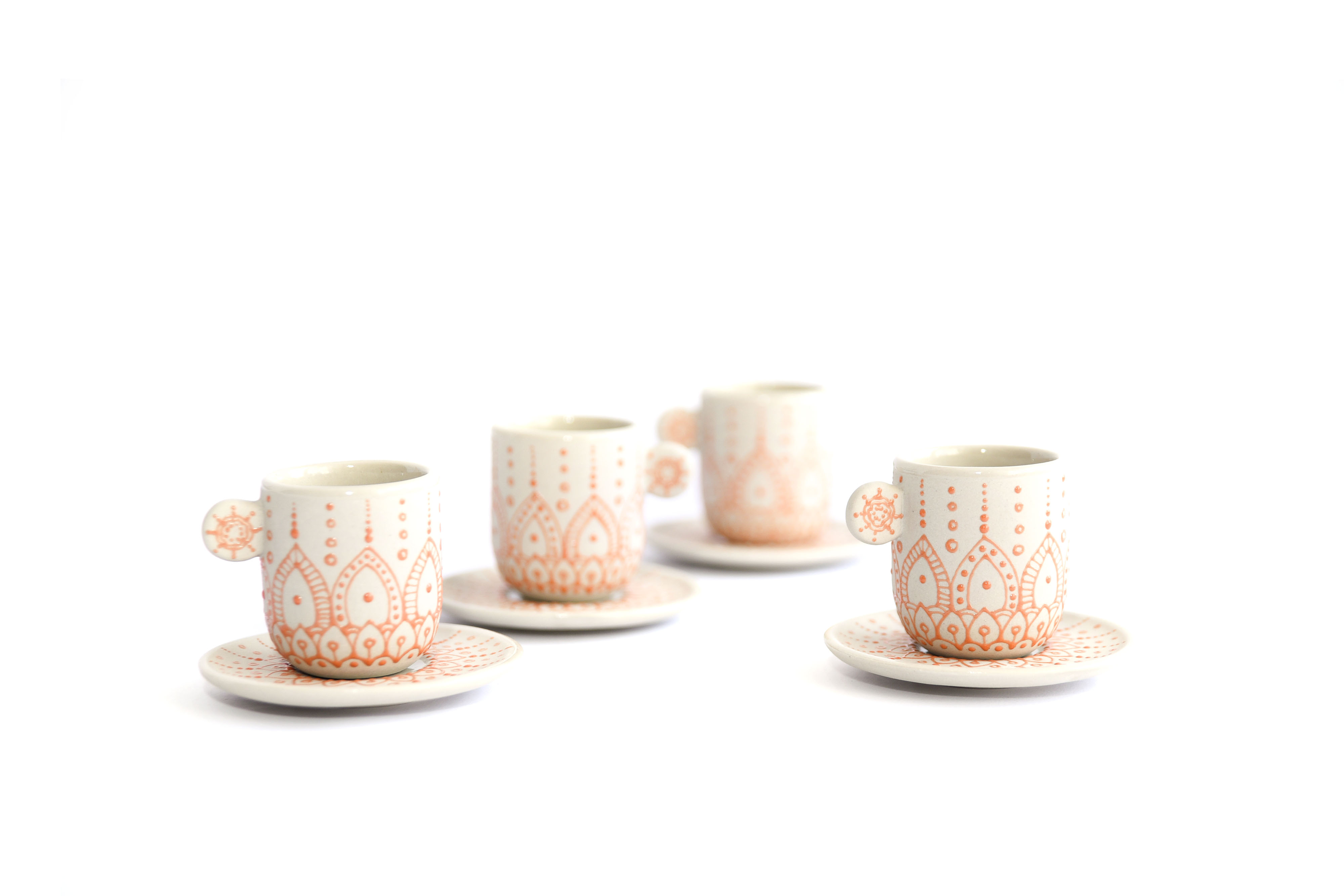 El set de espresso es decorado a mano con la tradicional técnica de la familia Servín, con figuras y colores que reflejan armonía y calma. Se ha utilizado cerámica de alta temperatura horneada a 1240o, sin plomo.