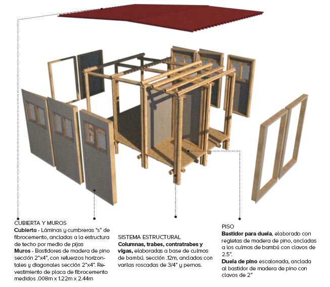 Este módulo garantiza el acceso y la correcta gestión del agua, el saneamiento y la higiene básica para las familias de los asentamientos populares urbanos y rurales. El bambú se puede utilizar para fabricar todos los componentes de construcción, tanto estructurales como no estructurales.