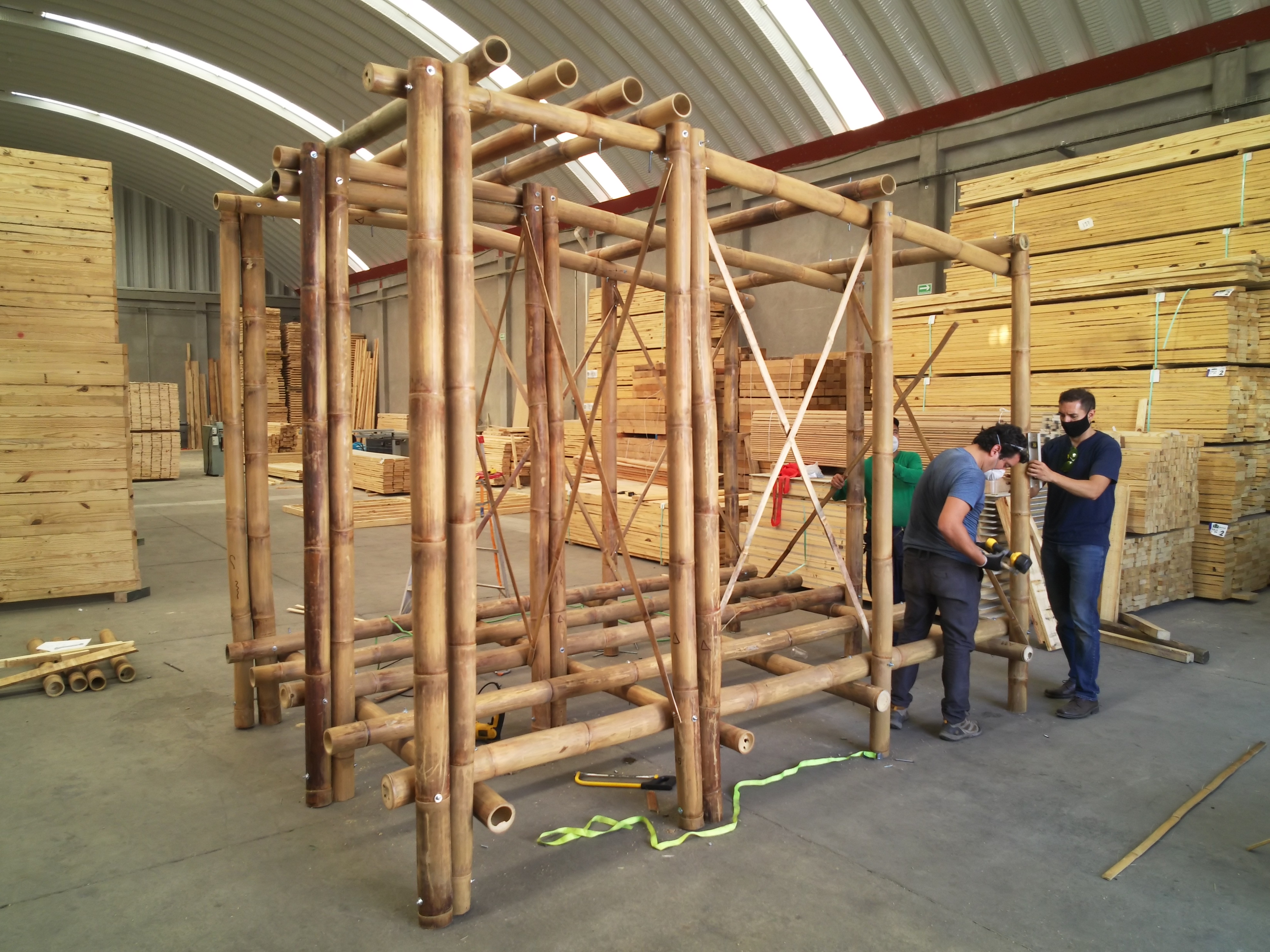 La construcción de edificios de bambú se caracteriza por un enfoque de marco estructural similar al aplicado con madera. Los elementos de piso, pared y techo están interconectados y dependen uno del otro para la estabilidad general.